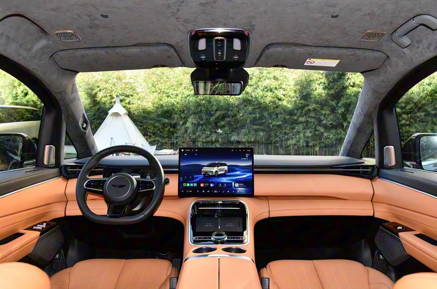 进入车内,座舱融入中国传统建筑层次感设计,大面积软性材质包裹搭配木纹饰板,营造豪华舒适氛围,配备15.4英寸中控屏+10.25英寸仪表屏,搭载骁龙8295P芯片与Flyme Auto 2.0系统,配合星睿AI大模型,支持多方言语音交互与场景化主动服务。二排配备吸顶娱乐屏与5.98英寸扶手控制屏,操作便捷省心。空间得房率高,并且提供6/7/8三种座椅布局可选,二三排纵向空间均超1000mm,实现“三排平权”。二排云感SPA座椅支持加热、通风、SPA级按摩,配备Flyme Sound 27扬声器系统与AI无麦K歌功能,舒适性与娱乐性拉满。